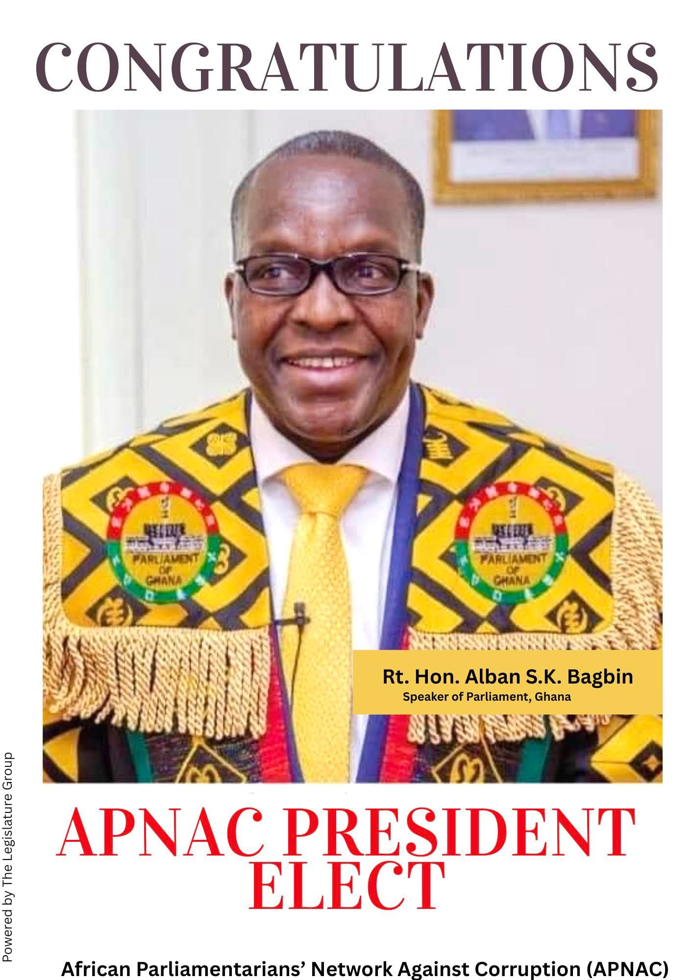 The Speaker of Parliament, Rt. Hon. Alban Sumana Kingsford Bagbin, has been elected President of the African Parliamentarians’ Network Against Corruption (APNAC) at the organization’s 9th Biennial General Meeting held in Accra.